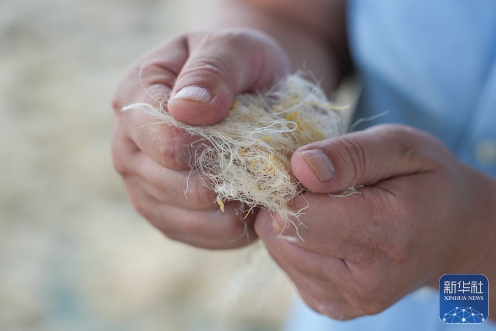 ↑ 9月20日,在新疆尉犁一家服装公司的罗布麻纤维脱胶车间,工人查看脱胶漂白后的产品品质。新华社发(汪志鹏 摄)