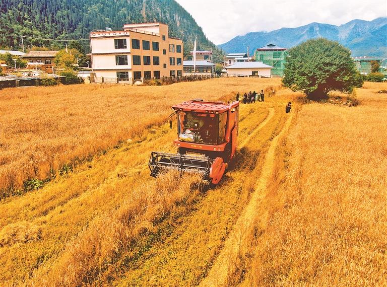在拉萨市墨竹工卡县唐加乡莫冲村,田间地头繁忙景象扑面而来。几台大型收割机轰鸣着在金色的农田里来回穿梭,收割、脱粒一气呵成,村民们跟在机器后方,有条不紊地进行后续整理工作,呈现出一派热火朝天的丰收场景。村民贡嘎顿玉向记者介绍,"我家共有37亩农田,10亩种小油菜,27亩种青稞。以前全家4口上阵得忙上一个多月,现在有了机械化作业,短短几天就能完成所有秋收工作,既省时又省力。"