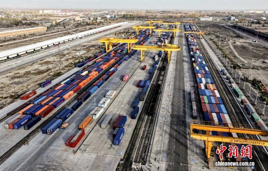 随着我国与共建"一带一路"国家的贸易往来日益紧密,新疆铁路双口岸运输优势日益凸显。图为霍尔果斯铁路口岸有序排列的集装箱。(无人机照片)