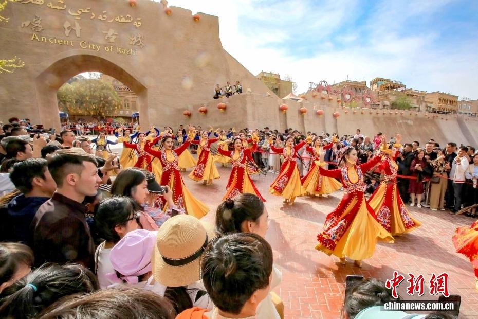 新疆不仅是众多游客向往的"诗与远方",还极具人文吸引力,生活在这里的多民族儿女像石榴籽一样紧紧抱在一起,团结奋斗、守望相助、和谐共融,共同建设着美好家园。图为游客在新疆喀什古城景区观看歌舞表演。