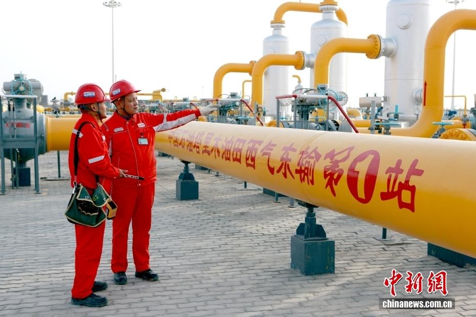 西气东输第一站位于新疆轮台县轮南镇,是塔里木油田西气东输工程起点,被誉为塔里木油田的"心脏"。图为西气东输第一站员工巡视装置,保障天然气供应。