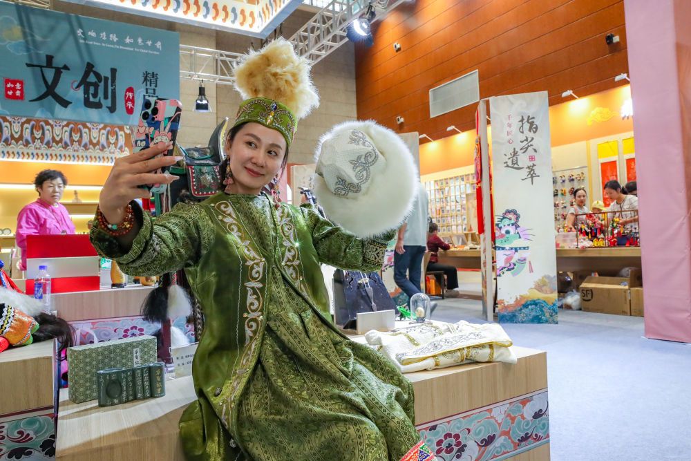 2025年9月22日,游客在敦煌文博会上身穿民族服饰自拍。9月20日至22日,第八届丝绸之路(敦煌)国际文化博览会在敦煌市举行。敦煌研究院“典范”“高地”建设成果展、甘肃文旅非遗文创展、敦煌·丝路雕塑展等多项展览同步亮相,集中展现了敦煌文化遗产保护、研究、弘扬的最新成果以及共建“一带一路”国家的文化艺术、非遗文创、风土人情等精彩内容。