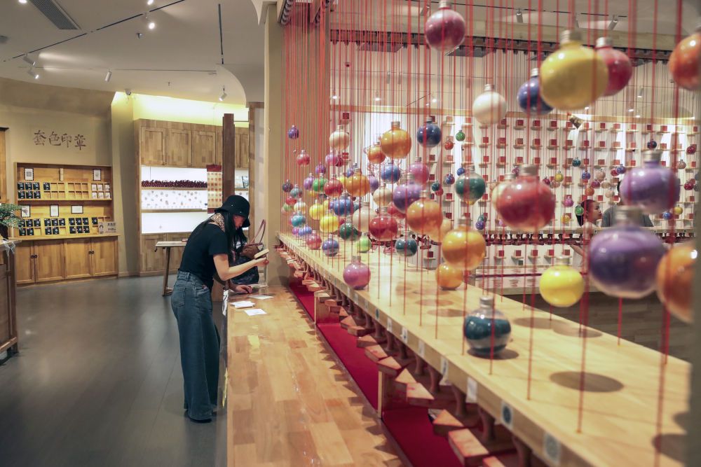 2025年5月10日,游客在敦煌文旅新打卡地敦煌印局体验文创印章。