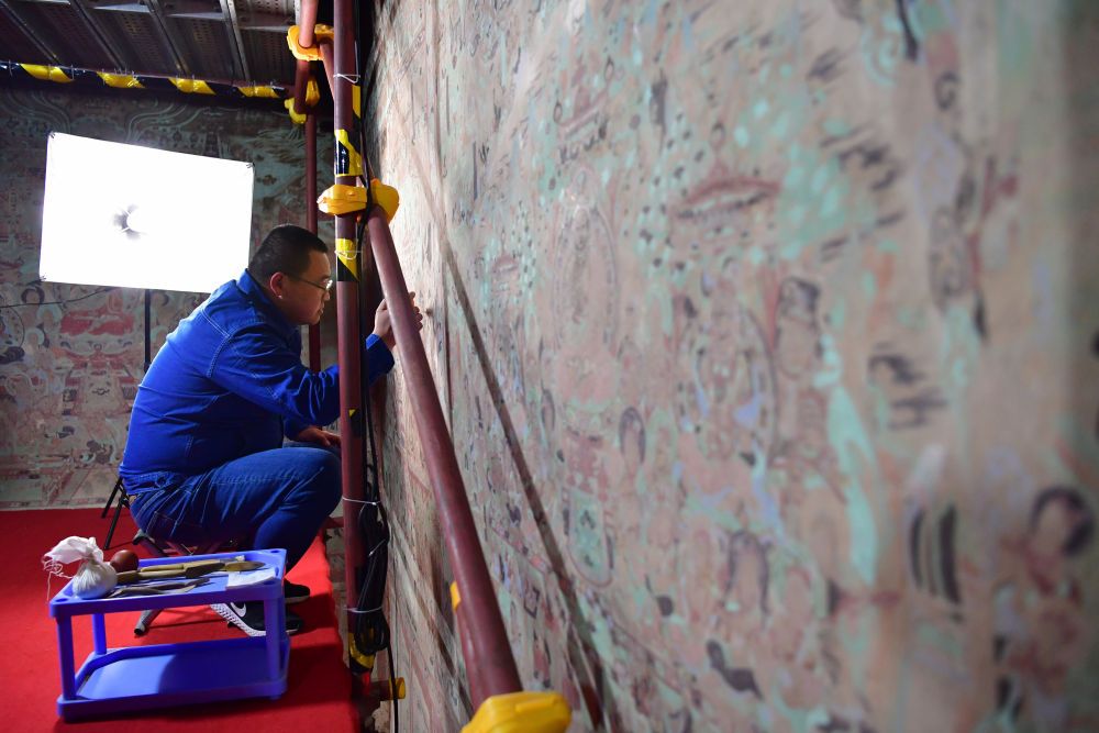 2022年4月19日,敦煌研究院文物保护技术服务中心的壁画修复师杨金礼在莫高窟第231窟内修复壁画。