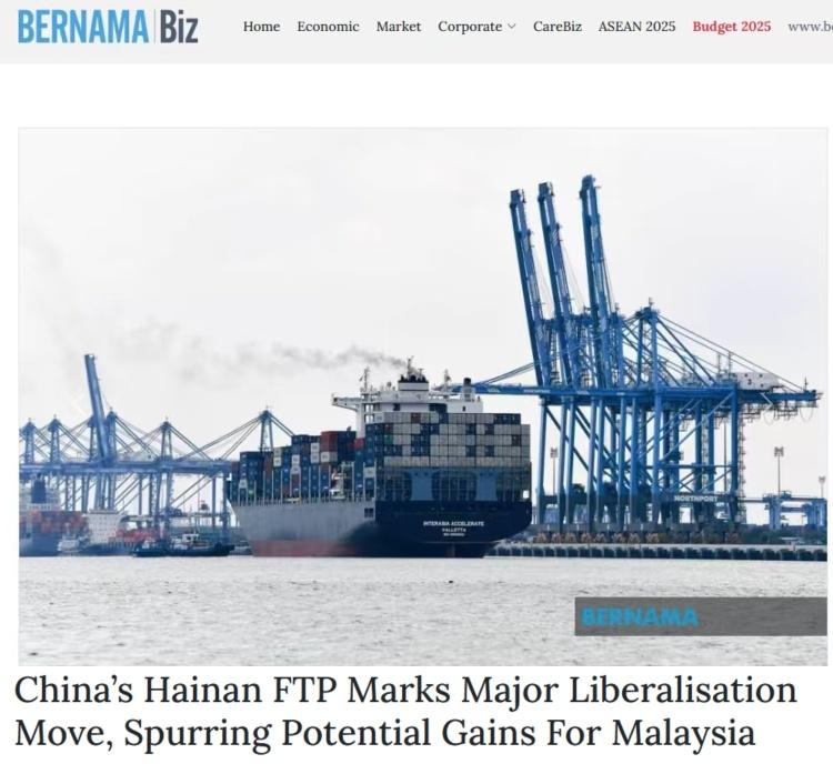 文章最后援引业内人士的话说,“高效的通关与资金流动、完善的物流设施与服务、活跃的旅游购物活动,以及整体上对产业、商业、贸易、旅游和消费的利好环境,将推动进出海南的集装箱运输量增长,并将对马来西亚的港口产生积极的溢出效应。”