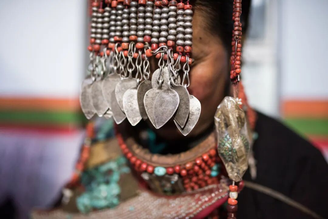 这些服饰上的花纹、颜色和装饰品都有特定寓意,记录着普兰悠久的历史和与周边地区的文化交流,被誉为“穿在身上的史诗”。这套服饰雍容华贵,单是穿戴就要一个多小时。地处贸易要道的普兰人,将遥远的珊瑚、黄金、蜜蜡、白银、绿松石、珍珠全都装饰在“宣”服上,展示着对这袭锦袍的无比珍视。