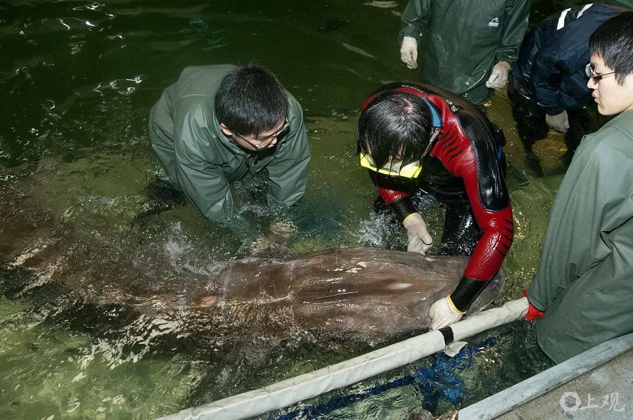 资料图:2014年3月8日在长江口抢救的受伤中华鲟