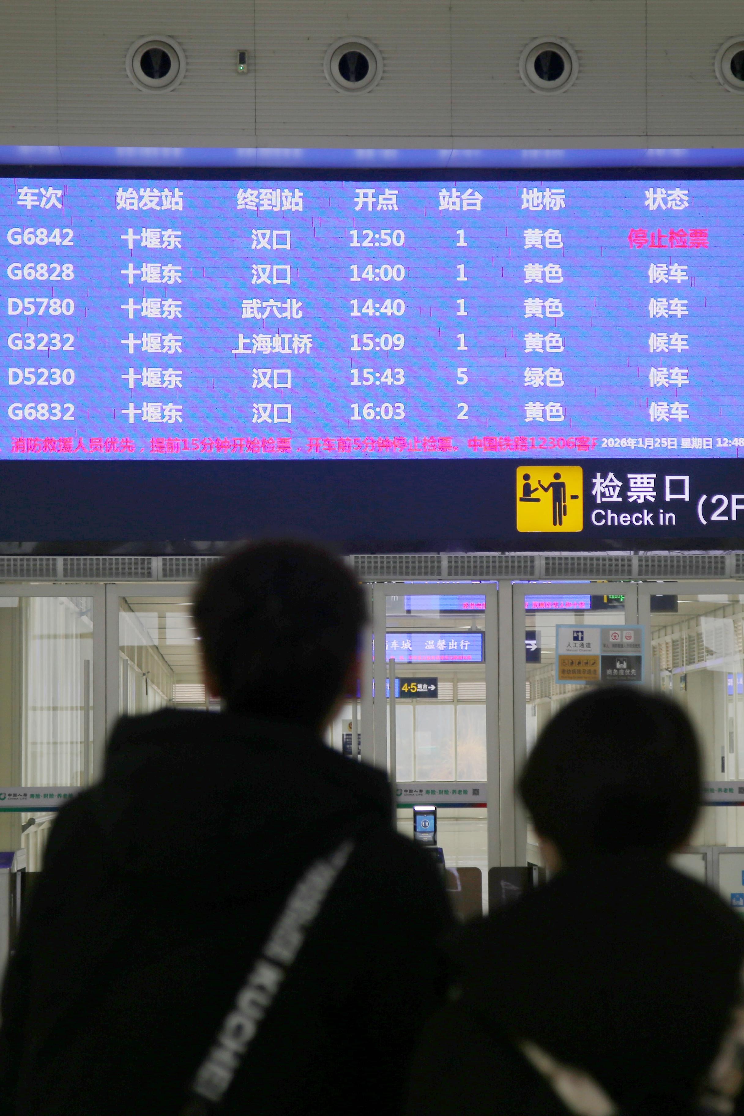 ↑ 1月25日,旅客在湖北十堰东高铁站查看车次。新华社发(曹忠宏 摄)