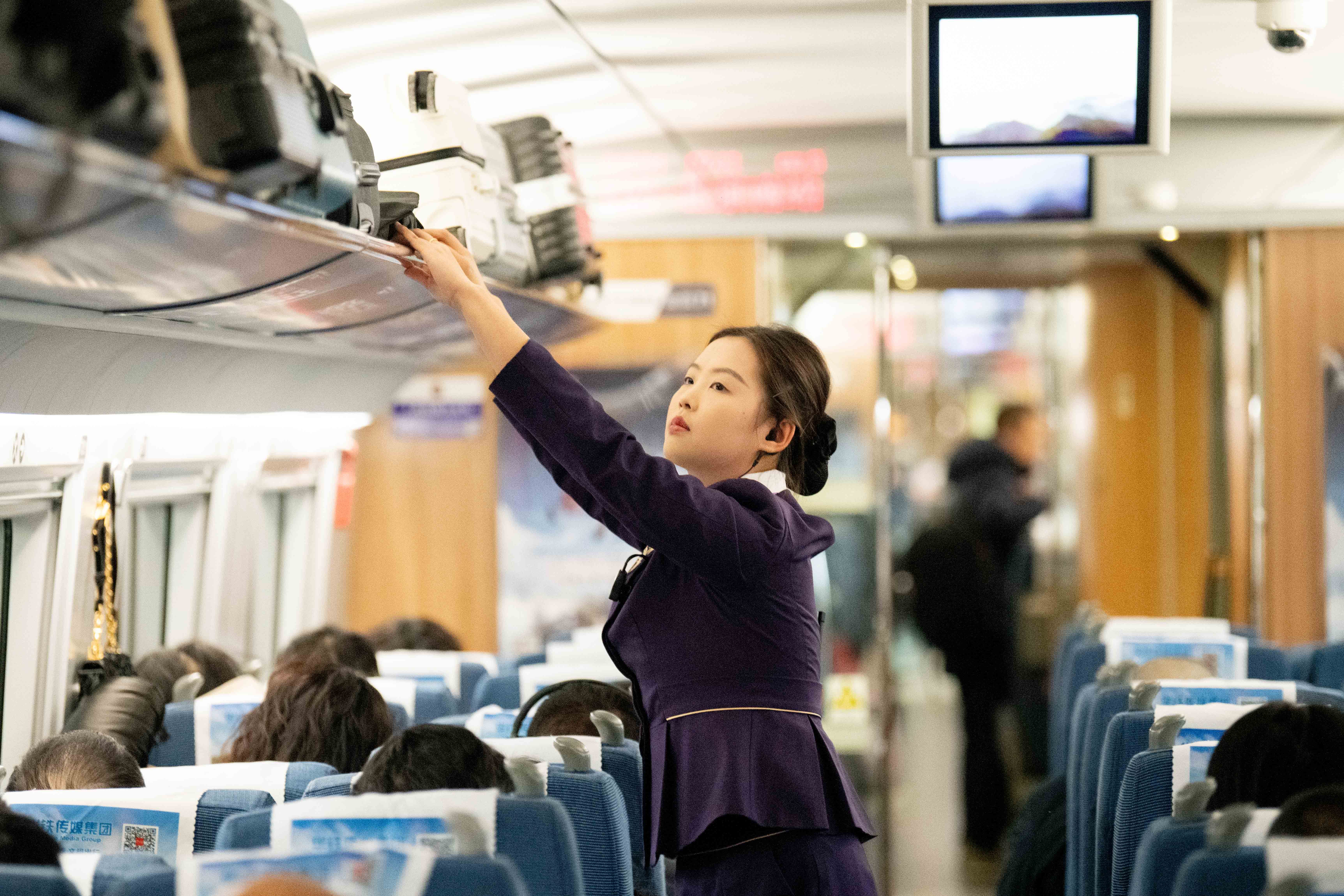 ↑ 1月25日,乘务员在泰州至北京南的G2584次列车上工作。新华社发(杨玉岗 摄)
