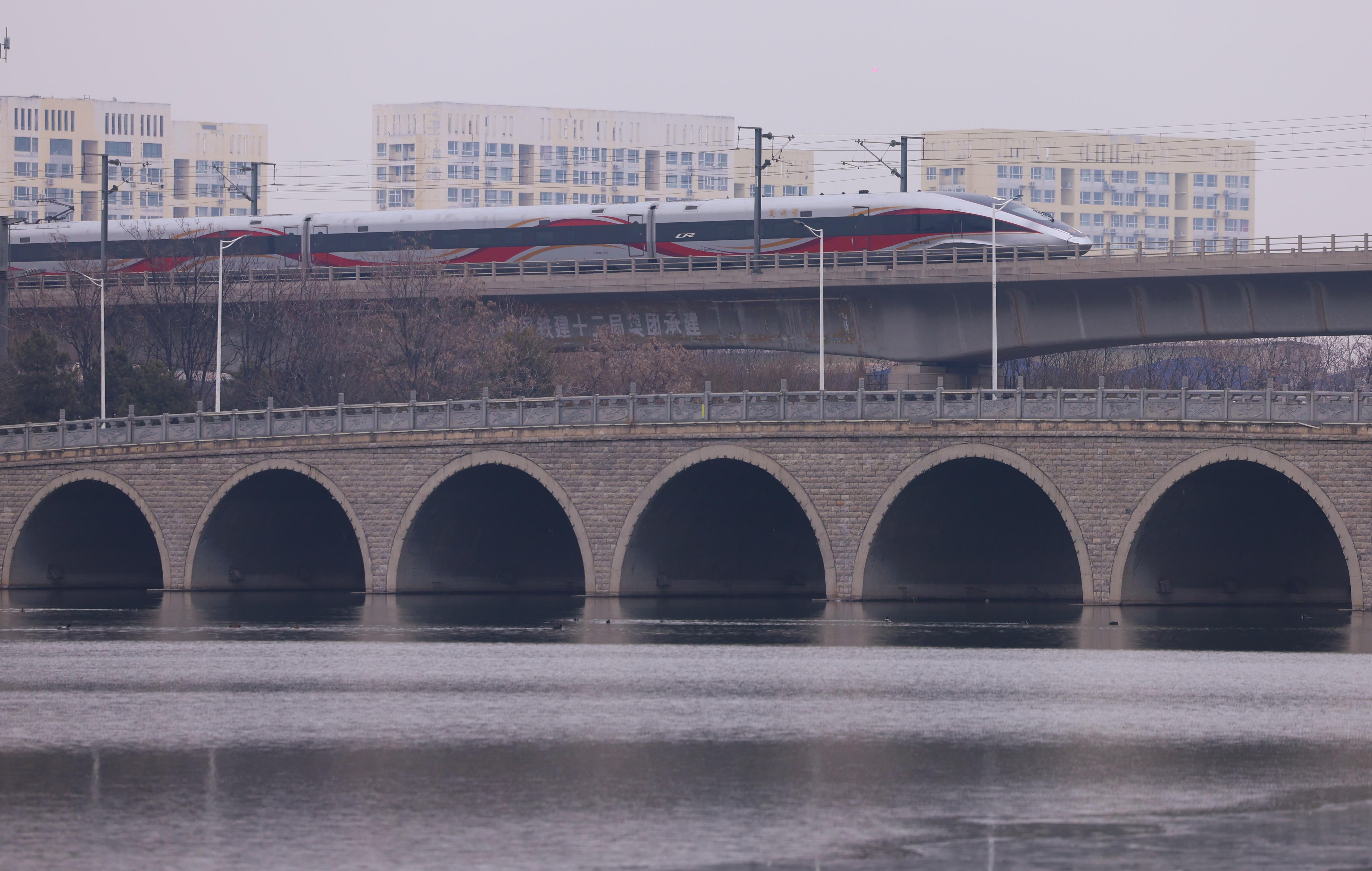 ↑ 1月25日,动车组列车行驶在天津市境内(无人机照片)。新华社发(杜鹏辉 摄)