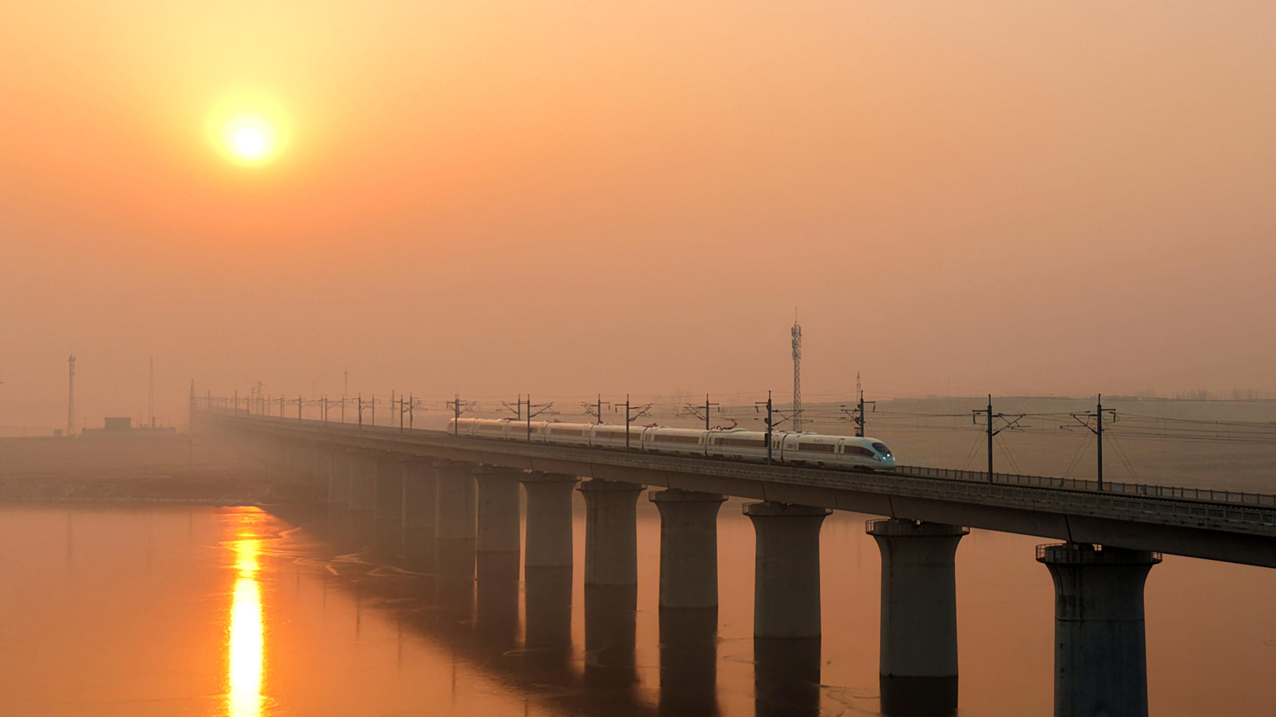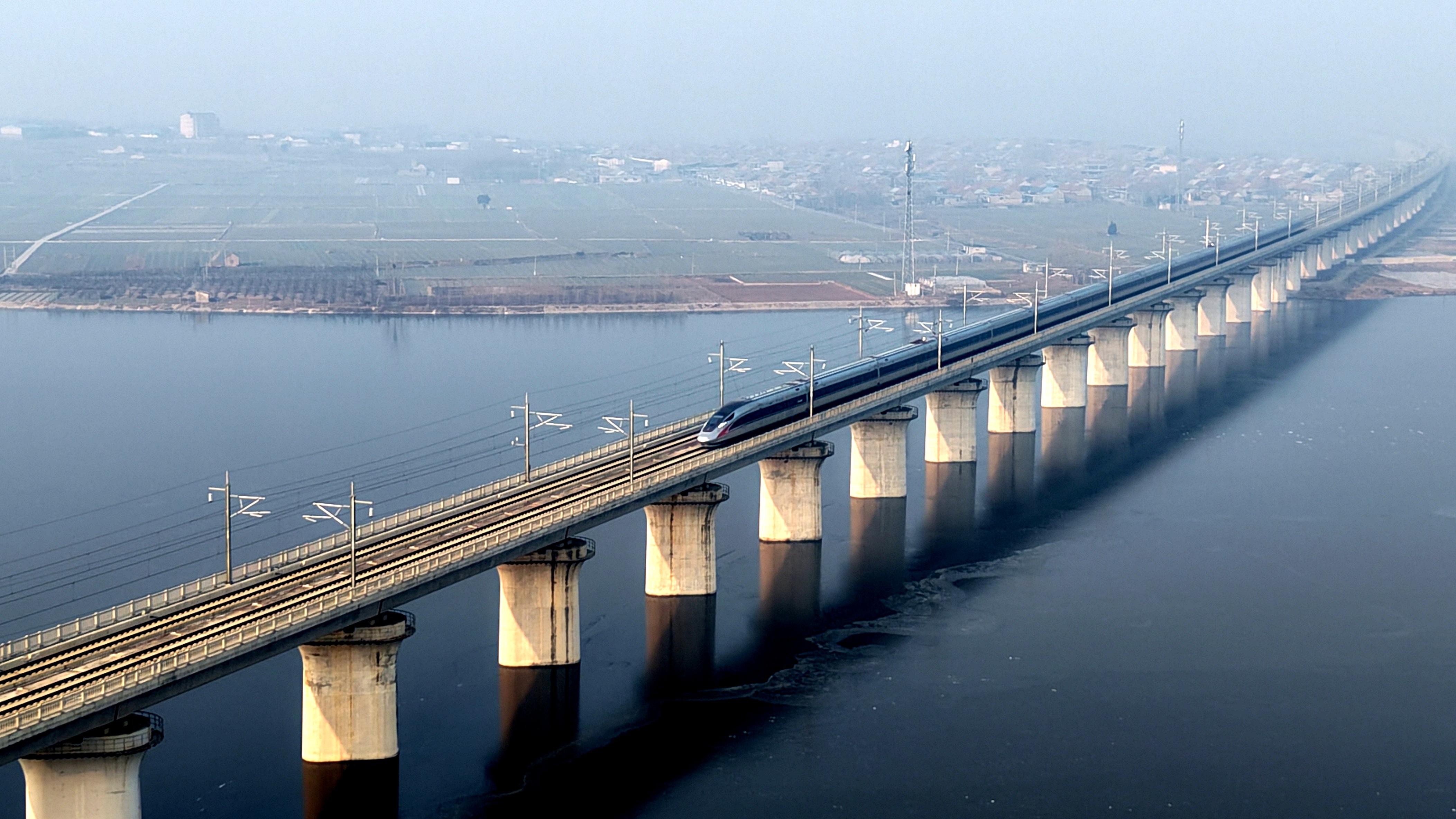 ↑ 1月25日,列车行驶在青荣城际铁路山东烟台段。新华社发(唐克 摄)