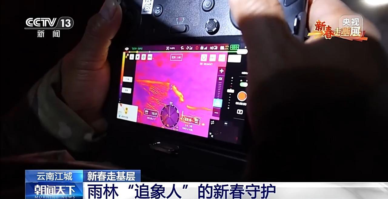夜幕降临,刁发兴突然接到队友的提醒,说是象群已经出山往村庄方向运动。虽然夜间山上没人,人与象直接遭遇的概率较小。但若有象群进村,就会给村民们带来困扰和伤害。刁发兴随即利用热成像无人机,开始监测象群周边情况。