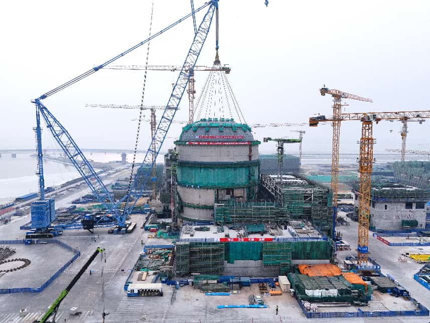 2月10日上午,820余吨重的核岛钢制安全壳顶封头吊装作业开始。中核辽宁核电有限公司供图