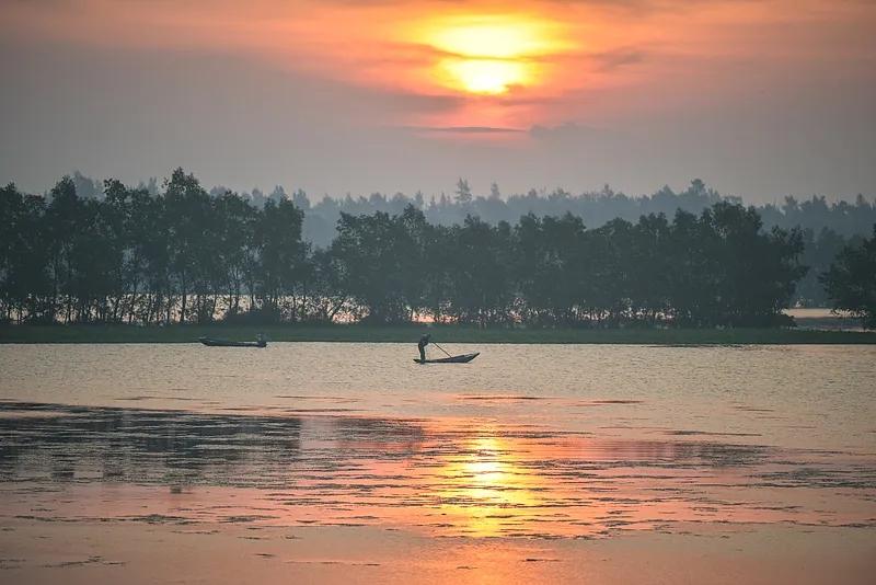 又见渔民们摇着船泛在金色的海面上