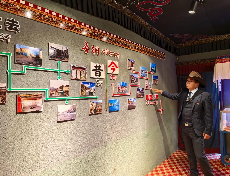 普纳村党支部书记拉巴次仁介绍普纳今昔对比。记者 马晓艳 摄