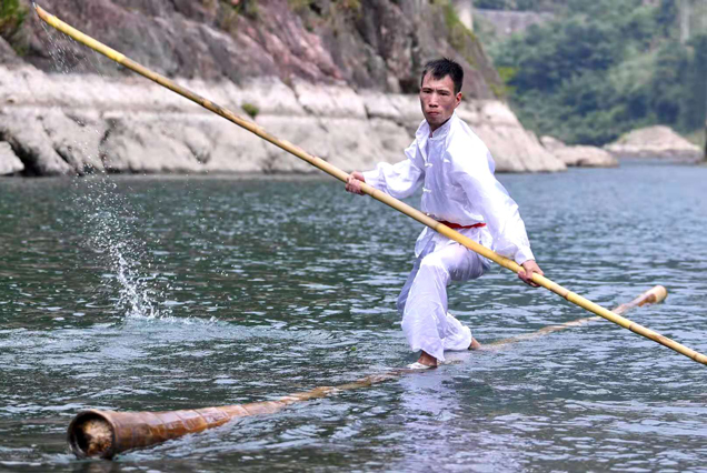“独木冲浪”表演。受访者供图 “独木冲浪”又称“站木”、“跳仝”。在冲浪过程中,冲浪者双脚踩在一根长6—10米,直径20—30公分的漂浮原木上,双脚拉弓步,上身略微趋前。无论浪峰波谷,涛怒湍急,一切的身体平衡都仰赖冲浪者手中那根长约5米的竹篙。 远远望去,独木如箭出弦,两岸的高山密林随木头的移动飞速掠过,颇有“舟行碧波上,人在画中游”之感。冲浪者随竹篙掉头转向,逶迤向前,脚下的原木仿佛长了吸盘与他们融为一体,甚是壮观。 如今,历经时光洗礼,“独木冲浪”逐渐褪去维系生计的色彩,还发展出了“单人双木、两人三木、五人同木”等多种极具观赏性的表演形式,吸引了不少外地游客前来观赏。 |