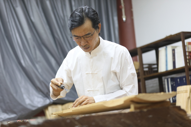 鱼腹状的槽腹结构,是形成古琴悠长声韵的物理条件。斫琴师需要根据每块木头的纹理结构、木质通透程度等要素,设计相应的槽腹结构。王文强 摄 “丝桐合为琴,中有太古声。”选材、定型、槽腹、灰胎、打磨、定徽、面漆、上弦……千年古法斫琴工艺,前后有上百道工序,一床琴至少需要七年打造。 造琴过程中,最能展现斫琴师技艺的,是挖槽腹。鱼腹状的槽腹结构,是形成古琴悠长声韵的物理条件。斫琴师需要根据每块木头的纹理结构、木质通透程度等要素,设计相应的槽腹结构。槽腹的深浅,中空的大小,底面厚薄的比例……所有微妙的细节,全凭一双手把握。琴声空灵和空洞的距离,可能只有一毫米,每次下刀,都考验着斫琴师的经验、手感与心性。 2010年,省级非遗项目古琴传统制作技艺代表性传承人谢建东,在长泰县天柱山脚下创建了中国龙人古琴文化村,为古琴安了“家”。2017年,古琴制作技艺被列入福建省第五批省级非物质文化遗产代表性项目名录。如今,龙人古琴文化村已先后被列为省级和国家级重点文化产业园区,成为文旅部国家文化产业示范基地和省级非遗项目古琴传统制作技艺保护单位。 |