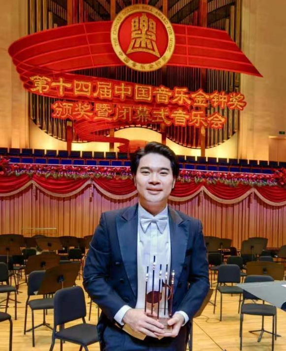 林自豪金钟奖捧杯 受访者供图 半路“出家”的音乐奇才 在很多人的印象里,学习艺术是一门童子功,许多获得成绩的艺术家都是从小就开始严格的训练。林子豪则不同,他的父亲林希是福建师范大学音乐学院硕士生导师,母亲也是一名音乐老师。虽然他出身音乐世家,但他从小最爱的一直都是篮球和足球,这两大爱好一直陪伴了他整个青春。 “我虽然在音乐的环境中长大,但从没有想过学习声乐。从小就不怎么唱歌,中学唱最多的就是哼几句周杰伦。”林子豪告诉记者,有的时候父亲在家里给学生上课时,他都出去打球,不然钢琴声、唱歌声,很难让他专心做作业。 走入声乐的世界,源于高三时的一次巧合。有一次,林子豪放学回家,母亲还没回来,林父说,“要不你唱两首歌来听听吧。”于是,父亲弹琴,林子豪演唱。在林子豪看来,这不过是父子俩无聊时的消遣,但在林父眼中,他发现了儿子嗓音上的闪光点。 “我觉得走音乐路是十分辛苦的,从小就不培养儿子走这条路。”作为引路人的林希表示,对于儿子他一直奉行的是快乐教育,自从发现了儿子嗓子的闪光点后,他常常以“上了一天学了,回家先放松放松,咱们唱会儿歌吧”为由,教他唱歌,慢慢培养他的兴趣。 在他的引领下,2006年,林子豪考入福建师范大学。进入声乐世界的林子豪很快就展现出了天赋,他本科二年级就获“福建省第二届大学生艺术节大学生歌手赛”学生专业组美声第一名;本科四年级时就代表福建参加CCTV全国青年歌手大奖赛,斩获福建赛区金奖并闯入全国总决赛。 本科期间,林子豪为了专业上的精进,他放弃了寒暑假的休息娱乐,选择在国家大剧院观摩学习。“在国家大剧院,歌剧排演的所有细节,导演工作的步骤、与乐队合作的全过程,还有那些著名歌唱家的表演为我打开了一扇艺术的大门。”