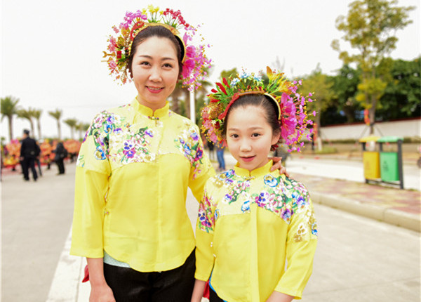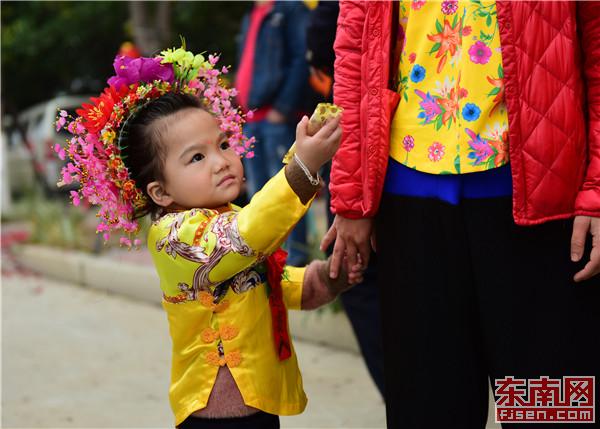 随着时间流逝,穿着蟳埔女传统服饰的年轻人越来越少,但不少老人还是有意识地为孩子穿上传统服饰,希望传承这一文化。东南网记者 林婕 摄 正因蟳埔女服饰承载的意义重大,这份文化符号背后的传承就显得弥足珍贵。黄晨感慨道,以前的蟳埔女,自出生后家中便开始准备传统服饰,从小穿到大。如今在村中,穿着蟳埔女传统服饰,盘头戴簪花围的多为中老年女性,年轻一代穿着传统服饰的人数十分少,“很多人连穿都很少穿,更别提能制作这些传统服饰了。” 近年来,蟳埔女习俗在多方宣传下得到了越来越多的关注,蟳埔女这一独具特色的形象也吸引了不少人的注意,在多个民俗文化节上均能看到身着蟳埔女传统服饰的年轻女孩致力宣传这一形象及背后的民俗文化。但热闹之余,愿意真正学习蟳埔女服饰制作的人依然是少之又少,“曾经有人来找我学过这项技艺,但是学过一段时间后还是选择放弃了。”谈及此事,黄晨露出无奈的笑容,“现在让大家长时期待在一个房间里缝缝剪剪,很多人可能都做不到。” 走进高校 传统技艺唤醒传承希望