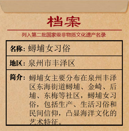 走进泉州市丰泽区蟳埔村,被粗网包裹的青灰色蚝壳随处可见,几座蚝壳厝藏于民居中,整个村庄显露出浓厚的“海味”。在这座海边渔村里最为亮眼的莫过于来来往往着装特别的蟳埔女——粗布斜襟右衽衣简朴宽松,搭配七分黑裤,头发绾成髻,戴着鲜艳美丽的簪花围,行走间便成了一道风景线。