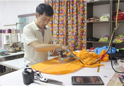 蟳埔女服饰宽松美观、方便劳作,也成为当地一大文化特色。 东南网记者 林婕 摄 “蟳埔女的服饰,其实从一开始就是为了方便劳动而设计的。”黄晨告诉记者,蟳埔女所着衣服多由棉麻粗布制成,宽松舒适,上衣为斜襟、七分宽袖、右衽,俗称大裾衫,裤子为七分阔腿裤,这样的设计便于在海滩上劳作,挑担行走又轻松自如,“以往的衣服以蓝色、灰色、黑色为主,朴素又耐脏,而头发也是刻意盘成一圈,再穿一根骨簪固定,防止低头时长发垂下影响劳作。” 黄晨表示,蟳埔女服饰已有数百年历史,以往均为手工制作,工序精致。1973年,11岁的黄晨师从自己的舅公,开始学习蟳埔女服饰制作,“一开始也是想着学一样手艺,学着学着就越来越感兴趣,三年多后,我就开始独立进行制作了。”以往蟳埔女服饰为纯手工制作,广到画线剪裁、细到每处针线缝合都需要依靠双手完成,这一过程需要花费较长时间,对制作者的细心与耐性都是一份考验,“有时一站就是几小时,尺寸也不容有一丝差错。”到1978年后,同期学习这项技艺的20多人陆陆续续转向了其他行业,只有黄晨选择了坚守,“这种传统的技艺经过很长一段时间流传下来,现存的就是精华,需要有人守护。” 几盏茶后,黄晨来到制衣间制作一件衣服。蟳埔女服饰的制作对布料有一定要求,“一般使用棉布或者麻布制作,经薯榔汁等染成深色,以防在劳作过程中被海水侵蚀或被阳光暴晒褪色,后来生活方式变得多样了,布料颜色也丰富了。”橙黄色的棉布根据顾客自身的尺寸画好线后裁剪,布料裁剪尺寸一般不能太长太宽,以防海边劳作时被渔网缠住,但又要设计得宽松,方便弯腰伸手等,这就要求制衣者具有丰富的经验。裁剪后的布料边角用浆糊粘合固定后进行熨烫,如此反复多次,再使用缝纫机缝制。一个多小时间,黄晨在熨衣的桌板与缝纫机前来回走动,一件上衣才初见雏形。“这还不是最费时间的,缝合衣服上的盘扣还需要两三个小时。”黄晨介绍道,如今制作一件衣服需要花费5个小时左右,包含画线、裁剪、粘合、熨烫、缝合等步骤,有时一天只能做上一套蟳埔女服饰。精细繁杂的工序耗费时间长,但成品颇受顾客喜爱,“手工的衣服布料穿起来都比较舒适,其次用双手做出来的东西,不大容易坏,跟机器做出来的也还是不一样的。” 怀揣初心 数十年坚守期盼后继有人 一套传统服饰,既体现了蟳埔当地的风土人情,也成为代代蟳埔女性勤劳奋斗的缩影。2007年,黄晨在丰泽文体部门的支持下对蟳埔女服饰制作中心进行改造,成立了蟳埔女传统服饰传习所,希望能将此作为展示和交流蟳埔女习俗的重要窗口。 不同材质的布料,制作精致的成衣,色彩丰富的簪花围头饰,防水轻便的腰包,乃至形象逼真的蟳埔女人偶……在蟳埔女传统服饰传习所,记者见到了各式各样的蟳埔女服饰,所有的服装成品均为黄晨亲手制作。“有些衣服中其实都藏着故事。”黄晨指着一件由两种花色拼接而成的衣服介绍道,“以往人们衣服都是一种颜色,会出现这种拼接的衣服,主要是因为很多蟳埔女在挑担做事时肩头部分容易磨破,但又舍不得其他地方完好的布料,就干脆拿另一块布料拼接在一起。”寥寥几句,便将蟳埔女辛勤朴素的形象勾勒而出。