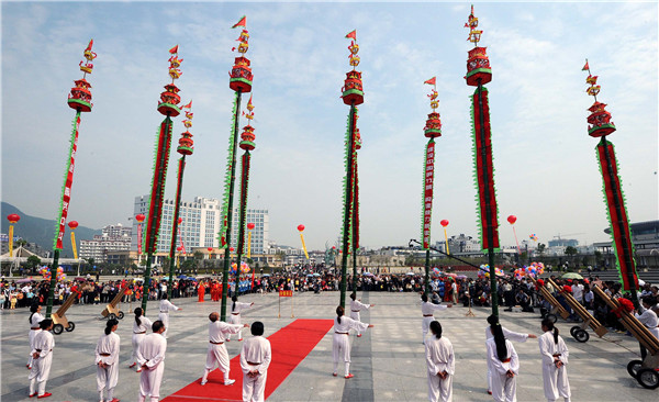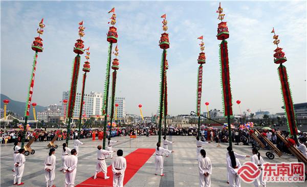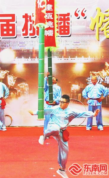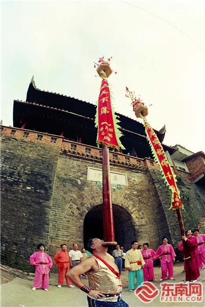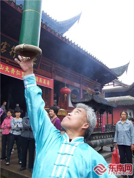 建瓯挑幡经常应邀参加节庆活动表演。魏永青摄 一会儿将竹竿紧咬嘴中,一会儿玩转手间,时而抬升时而坠落,时而静止时而旋转……9月23日上午,在2019“中国农民丰收节”全国70个现场直播点之一——浦城“中国农民丰收节”现场,一群表演艺人身着统一服饰,手持一根十余米长的竹竿,竿顶有装饰,独特又惊险刺激的表演引来观众的阵阵叫好。这便是被誉为“中华一绝,天下第一”的建瓯挑幡!在建瓯乃至闽北,或逢年过节,或大庙会,只要遇到喜庆的日子、高兴的事,都能看到幡舞翩跹的景象。 高超的技艺、热烈浓郁的乡土风韵,让建瓯挑幡名扬海内外,中国上海大世界吉尼斯总部将其列入“吉尼斯大全”,2005年,建瓯挑幡被列入福建省第一批省级非物质文化遗产代表作名录;2008年,又被列入第一批国家级非物质文化遗产扩展项目名录。作为有着300多年历史的古老技艺,建瓯挑幡历经风雨,在一代代挑幡艺人的传承和坚守下,日益焕发出勃勃生机。 陈泉成:“建瓯挑幡第一人” 建瓯挑幡始于明末,建宁府(今建瓯)大洲造船的工匠应征入伍民族英雄郑成功收复台湾的队伍。在收复台湾后的农历正月二十四,百姓为迎接凯旋的将士,设宴席唱戏,将士们则将带回的军旗捆在长竹竿头,尽情挥舞,对壮烈捐躯的弟兄们寄以深深的怀念。以后每年均以此礼节告慰英烈,逐渐演化成当今建瓯民间特有的挑幡习俗,世代相传。