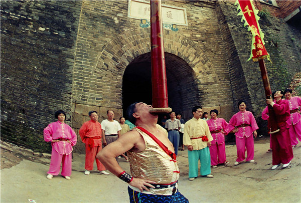 老方的一指禅。 魏剑生 摄 方振南是陈泉成的弟子之一,不仅手艺了得,更是建瓯少儿挑幡的“领头羊”。大家都亲切地称他为“老方”。正是他十年来的坚持和努力,让挑幡得以一代代传承下去。 从1961年开始学杂技,1986年开始学挑幡,老方说起挑幡头头是道。“这东西一点都不神秘,就是靠练。一要体力好,二要站得稳,三要会用巧劲。我总结了7个字:眼帅,手将,脚是兵。”别看老方说得轻巧,真要练到随时都能表演的功夫,最快的也要一两年。 “用蛮力是不行的,你和20公斤重的东西较什么劲。”老方咧着嘴指着自己漏风的牙说,当初,他的牙就是在一次表演时被打裂的。“当时安排前排的人往后抛幡,后面的人接住,但我前面那兄弟可能紧张了,力道太大,我一接,整根幡朝我脸倒下来,牙都被砸裂了。” 但老方也说,只要有人指导,别做难度太大的动作,挑幡还是安全又能强身健体的。 老方带我们到他平时存放器材的小仓库,打开铁门,一路佝偻着腰的老方忽然精神起来。只见他端出了一根10米多长,近20公斤重的幡,顶端有一座装饰用的竹骨和彩绸制成的六角宝塔。“手痒了,给你舞两下?”老方边说边耍了起来。这根许多人拿都拿不直的幡,似有灵性一般,辗转腾挪间,稳稳地“站”在肩膀、牙齿、脚面、大拇指甚至鼻子上。 今年69岁的老方是建瓯市建州技艺团的老团长。老方的队伍目前有30多名队员,还教着40多个孩子。平常团里队员都有各自的事业,比如老方就开了家中药材店,其他队员种菜、做小买卖等等。“社团没什么收入,接表演的收入也要用来维护器材,挑幡只能纯属业余爱好。”老方有些无奈地说。