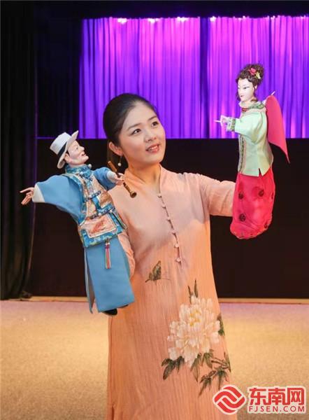 蔡美娜向外国友人传授晋江掌中木偶技艺。受访者供图 为了让更多人了解晋江掌中木偶戏,蔡美娜与剧团同事克服种种困难,坚守在表演领域传播这项艺术文化。2016年,第五届上海国际木偶艺术节上,蔡美娜表演完毕回到后台,一名外国嘉宾便找到了她,跟她学了几个掌中木偶的表演动作,“虽然我们语言不通,但是艺术是没有界限的。”这次经历给蔡美娜留下了深刻印象,她意识到将这项艺术继续传承并发扬创新的重要性。“‘木偶人才培养计划’在2012年被联合国教科文组织列入人类非物质文化遗产优秀实践名册,作为南派布袋戏省级代表性传承人,对发扬传承这项艺术,我也有义不容辞的责任。”