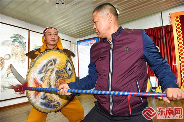 陈文英(左)与师兄张纬荣练习藤牌操 东南网记者 张哲昊 摄 今年55岁的陈文英正是陈锦和的曾孙,他说,自己家中世代传承藤牌操,祖父陈阿命过去常在家中教导伯父陈辉生练习藤牌操,二人都是当地响当当的藤牌操手,他耳濡目染,对藤牌操产生了浓厚兴趣。 可惜的是,“文革”期间,藤牌操所用兵器均被收缴,这项流传了数百年的民间艺术逐渐消匿于田间地头,传承一度式微。直到上世纪80年代初,第三、四代传人们一口气招收了26名弟子,才慢慢恢复元气,又重出“江湖”,重获生机。 陈文英就是这批弟子其中之一。18岁起,他便师从伯父陈辉生,成为了平潭藤牌操第五代传人。 陈文英回忆,每逢宗族祭祀、佳节庆典等场合,藤牌操一定是必备表演项目,围观群众众多,可以说是“万人空巷”。 在表演过程中,藤牌操手身着仿古武士装,右手持兵器,左手拿虎头藤牌,与“对手”“短兵相接”,随着音乐辗转腾挪,一时间刀光剑影,观赏性极佳。“身边许多朋友看完后,也会在闲暇时模仿起来,慕名前去拜师学艺的年轻人更是络绎不绝。”陈文英回忆说。 尚武之风再度兴起。在这样的氛围下,陈文英开始了学艺之路,这一坚持,就是大半辈子。 学艺:苦练绝活,走上传承路