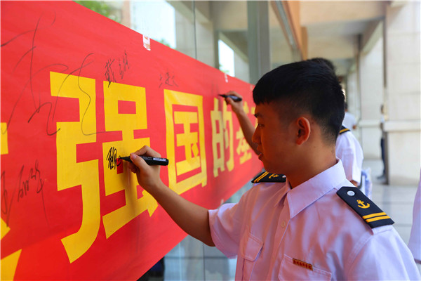 少年强国梦—2016年船员日期间,来自航海院校的学生齐聚条幅前庄严签名。福建海事局 供图