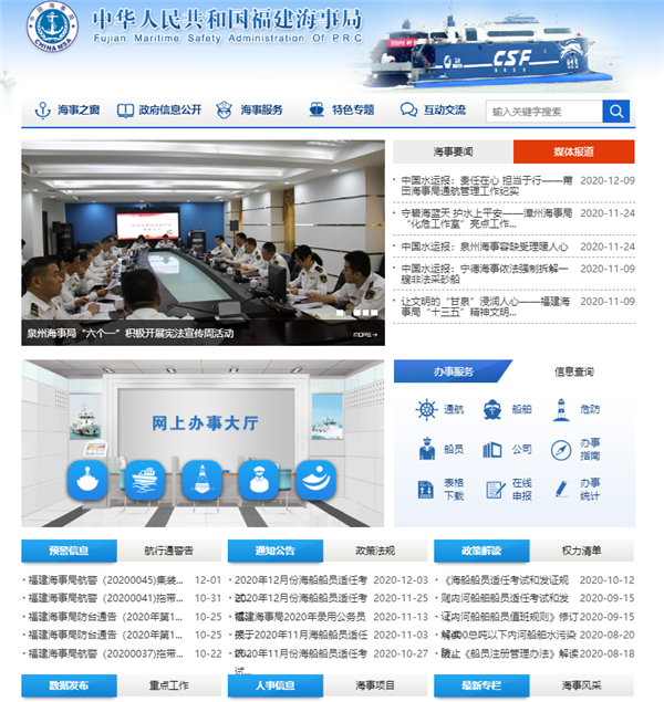 福建海事局官方网站首页。福建海事局 供图 打开福建海事局的官方网站,体现海事特色的蓝白两色主基调和简洁明晰的栏目设置映入眼帘,除了展示福建海事局最新工作动态外,处于网站首页上方核心位置的“网上办事大厅”格外引人注目:场景模拟与全国海事系统形象标识规范要求保持一致,行政相对人最常使用的“通航、船舶、危防、船员、公司”等5大类政务办理整齐排列。记者随机点击“船员”模块,“海员证核发业务”等9项船员业务一目了然。随着记者点击,申请条件、办理流程、所需材料、表格下载、网上申报、收费标准、办结时间等内容丰富详实,让记者这一船员业务的“门外汉”也很快就了如指掌、应知尽知。 “除了‘网上办事大厅’,‘信息查询’和‘政策法规’等模块也深得行政相对人的好评,不仅可以进行海员证、船员适任证书的查询,相对人还可以查询我们全局所有的执法人员、安全检查官、海事调查官信息;不仅能够了解各地市最新海事动态信息,还可以查阅最新的海事管理政策法规,并且还有最权威的政策解读。”福建海事局科技信息处处长杜建华介绍。福建海事网站群自创办以来,始终坚持以“互联网+”为指导,突出信息交流和业务办理,电子政务大厅实现了与全国海事综合服务平台、海事一网通办平台的对接,电子政务服务功能持续优化完善,95%以上业务实现网上办理。此外,该局还开发了公众微信号,实时发布海事监管、航运及船员产业等行业资讯及重要信息,为广大行政相对人提供高效便捷的一站式、全天候海事政务服务。 今年5月23日,福建海事局参与建设的“中国(福建)国际贸易单一窗口”4.0版正式上线,企业可通过“单一窗口”同时向海事、海关等口岸管理单位申请办理报关、报检和船舶出入境相关业务,无需再手持纸质材料往返于各口岸管理单位之间,大幅提高了申报效率。谈起参与“单一窗口”建设的事情,杜建华感慨颇多:“不是简单的把各口岸查验单位的数据汇集到一起,而是要实现真正意义上的‘互联互通、资源共享’,难度可想而知,但却是口岸通关提速的必由之路。所以我们当时提出要克服一切困难,主动融入、全力支持‘单一窗口’建设,一定要实现‘数据多跑路、企业更省心、群众得实惠’的目标”。 科技赋能,练就规范管理真功夫 “智明,麻烦把上周五事故调查的视频记录发给我一下,我需要核对一下对事故船船长的调查笔录。”几分钟后,通过“办公小助手”,1个多G的视频就下载完毕;“叮!”在外地出差的林处长收到短信,提示有一份紧急公文需要处理。林处长阅览完毕后提出办理意见,这份公文随即就发送到具体经办的人员,进入处理流程;“敏东,你通知一下,半小时后召开一个视频会议,各单位分管领导参加,了解一下各单位推进采运砂船专项整治行动的情况,然后布置下阶段的工作。”不久,7个分支局的实时画面陆续传输到福建海事局指挥中心电子大屏上,会议准时召开。