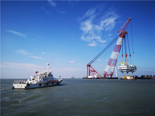 保障我国集成度最高、单体最大最重的海上升压站成功吊装,助力风电经济新业态。福建海事局 供图