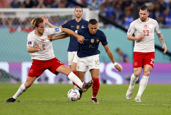 11月26日,丹麦队球员约阿西姆-安德森(左一)和法国队球员姆巴佩(右二)在比赛中拼抢。新华社记者 王丽莉 摄 第61分钟,姆巴佩在左路带球长驱直入,将球分给边路插上的左后卫特奥·埃尔南德斯,二人完成短传配合后,前者劲射打破僵局。 7分钟后,丹麦队三中卫体系中的克里斯滕森抓住角球机会,接队友的头球摆渡冲顶破门,将比分扳平。此时,比赛走势似乎向着平局发展,在2018年世界杯上,两队曾以0:0“闷平”。 第86分钟,法国队组织核心格列兹曼斜传过顶球,将球送到远门柱,姆巴佩高高跃起,用一个不标准的射门动作将球撞进球门,以2:1锁定胜局。两连胜的法国队率先从D组出线。 至此,下个月才迎来24岁生日的姆巴佩,职业生涯在世界杯上已累计打进7球。在上届世界杯上,当时19岁的法国新星打进4球,成为法国队夺得世界杯冠军的关键。 在今年的前两次交锋中,丹麦队占据上风,在欧洲国家联赛中两次击败法国队。 26日稍早进行的比赛中,澳大利亚队1:0力克突尼斯队,在D组中积3分。丹麦队和突尼斯队各积1分。小组赛最后一轮,“袋鼠军团”对阵丹麦队,法国队面对突尼斯队。 |