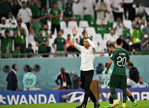 11月26日,沙特阿拉伯队主教练勒纳尔(左)赛后向观众致意。新华社记者 辛悦卫 摄 在阿根廷队与墨西哥队第二轮比赛结束前,目前沙特队以一胜一负积3分暂列小组第二。第三轮小组赛,他们将与墨西哥队展开较量。“下一轮比赛至关重要。”勒纳尔说,“我们要集中精神,力争取胜。” 对于沙特队本场比赛的表现,波兰队主教练米赫涅维奇给予充分肯定。“沙特队的进攻火力很强,只可惜他们没能把攻势转化为进球。”他说,“他们在防守端也采取了形式多样的战术,但我们把握住了宝贵的机会,打出了高效的表现。” 取得一胜一平的战绩后,波兰队目前暂列小组第一,他们下一轮将遭遇阿根廷队,米赫涅维奇认为,他们必须在接下来的比赛中继续提升攻防质量。“4分不能解决任何问题。”他说,“希望我们能尽可能走得更远。” |