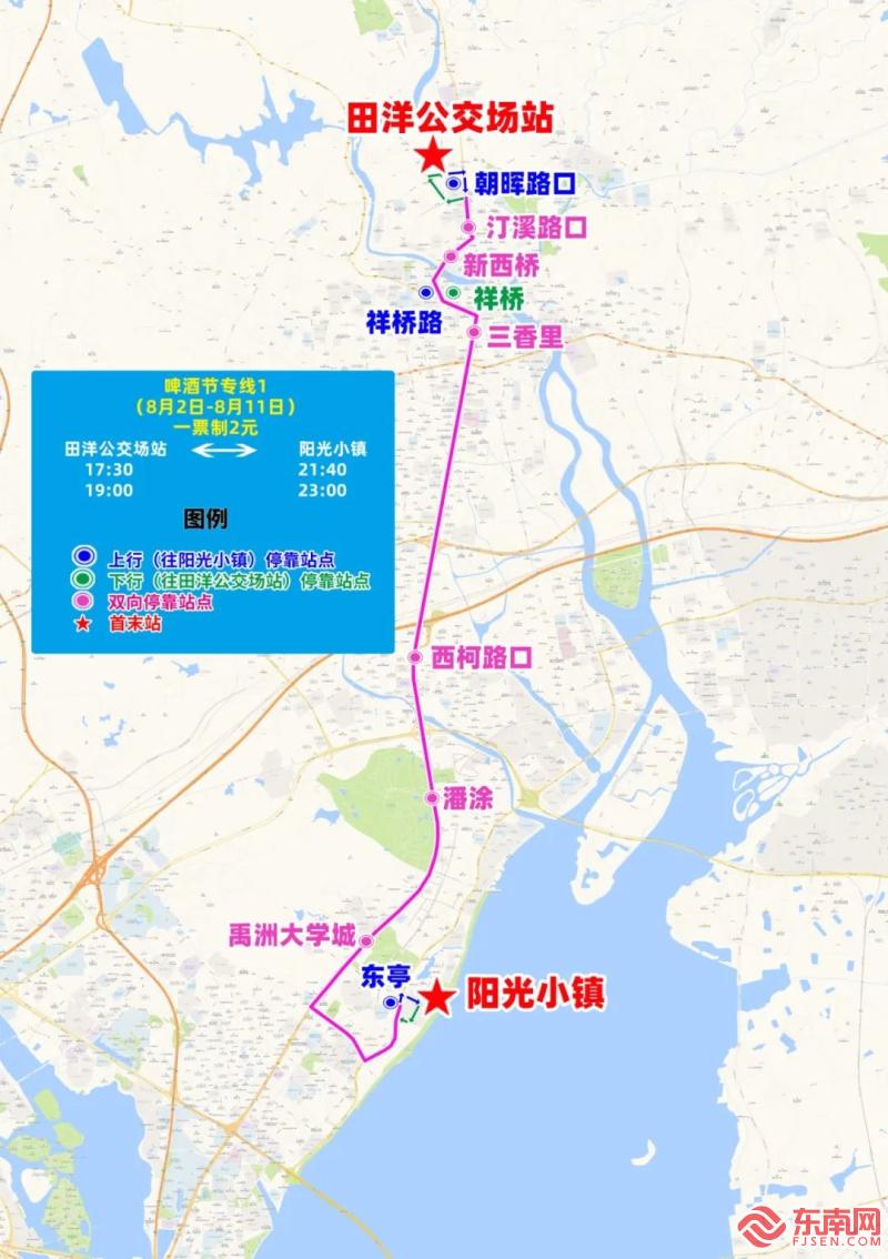 啤酒节专线1公交线路图(厦门运输中心供图) 1、啤酒节专线1(田洋公交场站 - 阳光小镇) 线路走向:上行从田洋公交场站始发,经同安大道、朝元路、环城北路、环城西路、祥桥路、银湖中路、城南路、同集路、天马路、滨海西大道、观波路至阳光小镇公交场站;下行从阳光小镇公交场站始发,经观波路、观滨路、观涛路、滨海西大道、天马路、同集路、银湖中路、祥桥路、环城西路、环城北路、朝元路、朝晖路、朝洋路、同安大道至田洋公交场站。 停靠站点:田洋公交场站、朝晖路口(往阳光小镇)、汀溪路口、新西桥、祥桥路、祥桥、三香里、西柯路口、潘涂、禹洲大学城、东亭(往阳光小镇、东侧站点)、阳光小镇。 线路长度:20.8公里。 发班时间:田洋公交场站为17:30、18:00、18:15、18:30、18:45、19:00;阳光小镇首班为21:40,末班为23:00(发车间隔15分钟)。 票价:一票制2元。 |