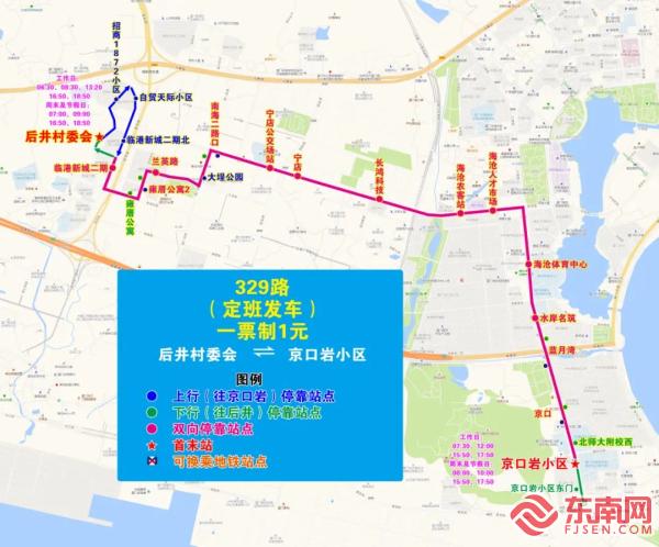 329路公交线路图(厦门公交集团供图) 329路公交线路调整 线路名称:329路(后井村委会—京口岩小区) 线路走向: 上行:从后井村委会出发,经过龟山北路、龟山三路、慈济东路、石囷中路、南海四路、双埕西路、兰英路、南海二路、南海三路、兴港路,最终到达京口岩小区。 下行:从京口岩小区出发,经过兴港路(建港路口调头)、南海三路、南海二路、兰英路、双埕西路、南海四路、石囷中路、慈济东路、石囷北路、龟山北路,最终回到后井村委会。 停靠站点:包括后井村委会、招商1872小区、自贸天际小区、临港新城二期北等新设站点。 线路长度:9.5公里,原长度为2.5公里。 发班时间:工作日和周末及节假日的发班时间有所调整。 |