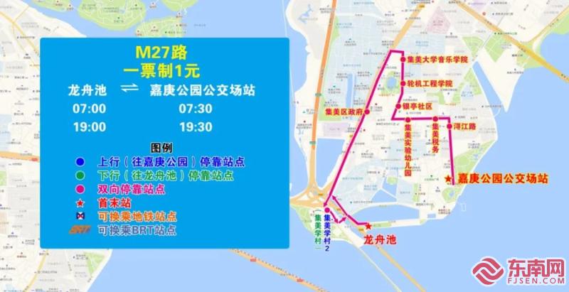 M27路公交线路图(厦门运输中心供图) M27路由银亭社区改至嘉庚公园公交场站始发,并改经石鼓路北段运行。线路走向为从龙舟池始发行至银江路集源路口,改经银江路、印斗路、石鼓路、集源路、浔江路至嘉庚公园公交场站,往返一致。增停集美区政府(往龙舟池)、集美大学音乐学院、轮机工程学院、银亭社区(东侧站点)、集美实验幼儿园、集美税务、浔江路(浔江路新设站点)、嘉庚公园公交场站(浔江路新设首末站),减停集美区政府(集源路)。线路长度从2.5公里变为5.5公里,首末班时间为龙舟池首班7:00末班19:00,嘉庚公园公交场站首班7:30末班19:30。其它运营方案不变。 |