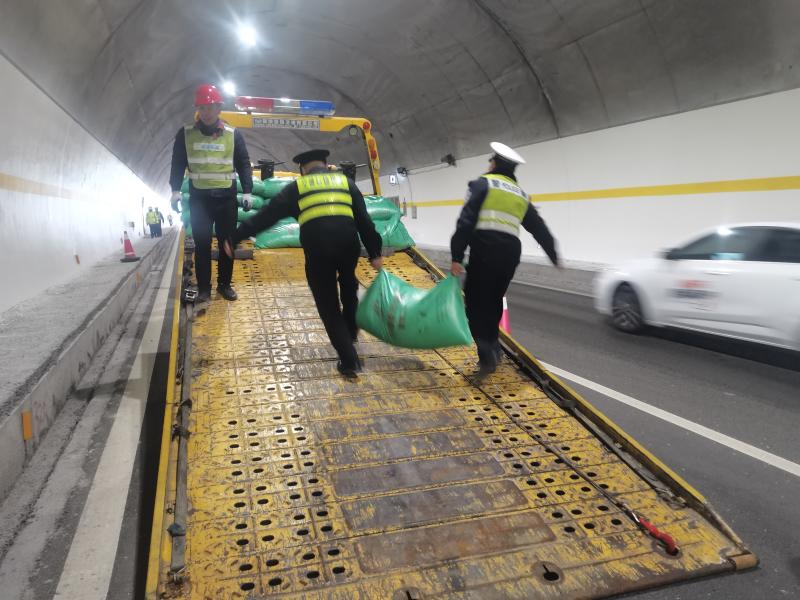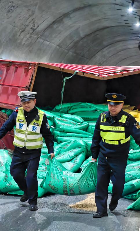 事故现场 鉴于隧道内特殊的行车环境,视线较差,为尽快清除事故隐患,避免交通拥堵以及二次事故的发生,执法人员迅速组织开展现场救援行动。高速交警、路勤站工作人员也迅速加入救援队伍,各方齐心协力,徒手将散落的大量饲料搬运至转运车上,力求最大程度降低事故造成的经济损失。