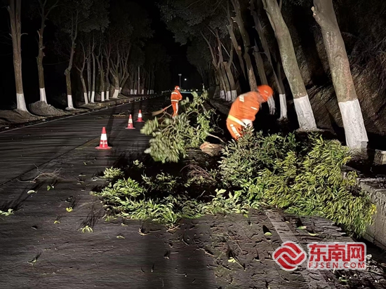 永春分中心一线养路工夜间处理倒伏路树。泉州市公路中心 供图