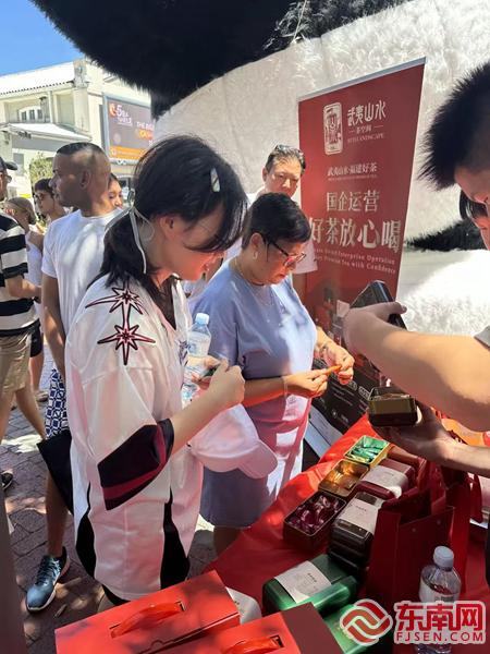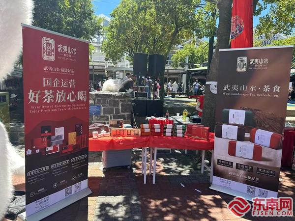 “武夷山水”产品走进开普敦布展现场 朱联辉 摄 东南网2月14日讯(通讯员 吴文菁)春节期间,在南平市首批海外招商大使朱联辉的努力推动下,南平市“武夷山水”品牌亮相第三届“四海同春 华星闪耀——开普敦中国年”活动,吸引了数万名当地民众与境外游客的目光,为这座城市披上了一层绚丽的中国红。此次盛会,中国驻开普敦总领事及南非西开普省、开普敦市的数位官员出席,共同见证这一文化盛事。 当得知南非开普敦即将举办“四海同春”活动,招商大使朱联辉等人迅速行动,与组委会、主办方紧密沟通,确保“武夷山水”品牌能在活动中占据一席之地,他们自费将“武夷山水”茶叶、茶器、茶点等特色产品运至南非,自费租用展馆、精心布展、制作宣传品,才使得“武夷山水”品牌得以惊艳亮相。