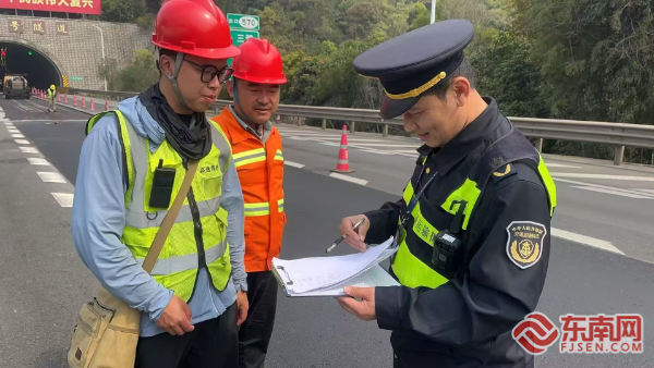 执法员现场查验施工记录。宁德高速执法支队供图 精细管理,闭环整改。强化施工全链条监管,严格检查施工区域警示标志设置、安全员配备及应急预案制定情况,确保风险可控。督促施工单位落实岗前安全培训、设备日检等制度,建立隐患整改台账,做到“即查即改、动态清零”。联合开展应急演练,模拟突发场景提升处置能力,确保关键环节万无一失。