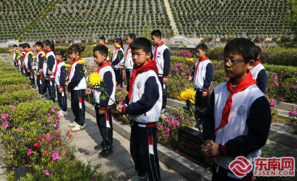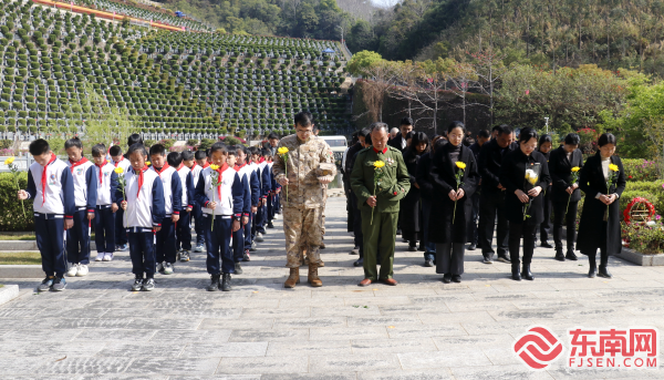 鞠躬默哀 东南网4月3日讯(通讯员 陈文华 文/图)清明时节祭忠魂,英烈精神励后人。4月2日,由莆田市荔城区新时代文明实践中心、区委文明办、区教育局、区退役军人事务局、共青团荔城区委、区人武部政工科主办的荔城区“赓续•2025•百园千校清明祭英烈”活动在荔城区烈士陵园举行,深切缅怀革命先烈的丰功伟绩。 位于莆田二十四景之一“壶山致雨”山麓的烈士陵园,苍松翠柏,青山环抱,“人民英雄永垂不朽”八个大字烫金大字格外醒目。全体人员齐聚在烈士墓碑前,缅怀为民族独立和人民解放事业英勇献身的革命先烈。 上午9时,祭英烈仪式正式开始,全体人员整齐列队,庄严肃立,奏唱中华人民共和国国歌,向烈士鞠躬默哀,铭记历史,追忆先烈们的不朽功勋;少先队员献唱《我们是共产主义接班人》。随后,全体人员手持鲜花缓慢走到烈士墓前瞻仰革命先烈,敬献鲜花,寄托哀思。