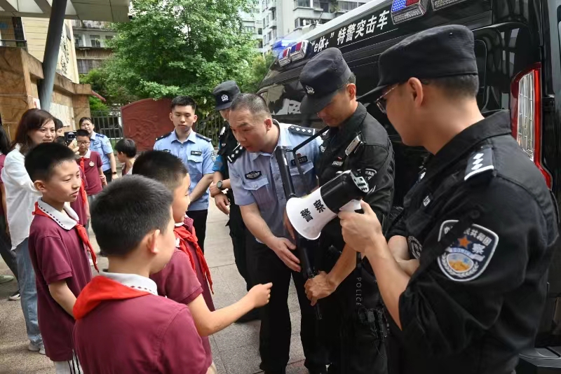 东南网5月28日讯(通讯员 蔡耀宗)在“六一”国际儿童节即将到来之际,为切实增强少年儿童安全防范意识和自我保护能力,进一步强化校园安全建设,5月27日上午,福州市公安局东街派出所、巡特警支队三大队联合辖区鼓楼第二中心小学举办“警营开放日”活动。 “哇,好酷呀!”“警察叔叔,这个枪我能摸一下吗?”“警察叔叔,这个无人机能飞多高呀?”92式手枪、95式步枪、头盔、防弹衣、警用无人机……在活动现场,近距离“触摸”警用装备,小朋友们一个个化身成“好奇宝宝”,围着民警们问个不停。 为了减少对学生们上课的影响,此次“警营开放日”采取民警送“学”上门的形式开展,民警开着特警防暴车,携带警用装备走进校园,让孩子们“零距离”体验警务装备,感受警营文化。活动中,民警们为孩子们一一展示了警用装备,讲解了每件装备的特点、使用场景,还让孩子们试戴了头盔、防弹衣等,许多孩子大呼“过瘾”,并表示长大了也要当警察,成为保护人民的忠诚卫士。