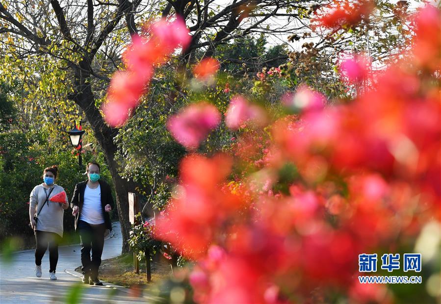 2月25日,两名游客在福州花海公园游玩。 当日,福建省福州市区阳光明媚,气温回升。一些市民在做好个人防护后来到公园游玩,感受春天。新华社记者 魏培全 摄