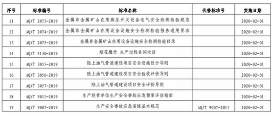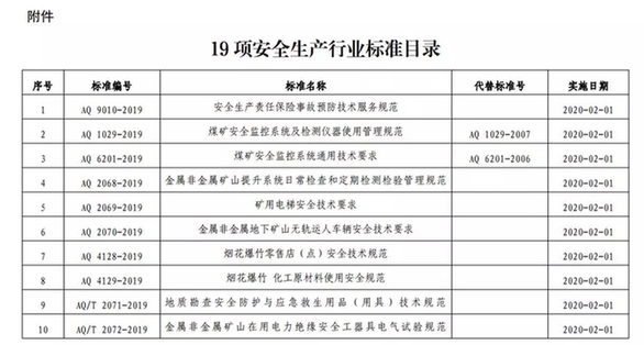 中华人民共和国应急管理部批准以下19项安全生产行业标准(目录见附件),自2020年2月1日起施行,现予以公布。