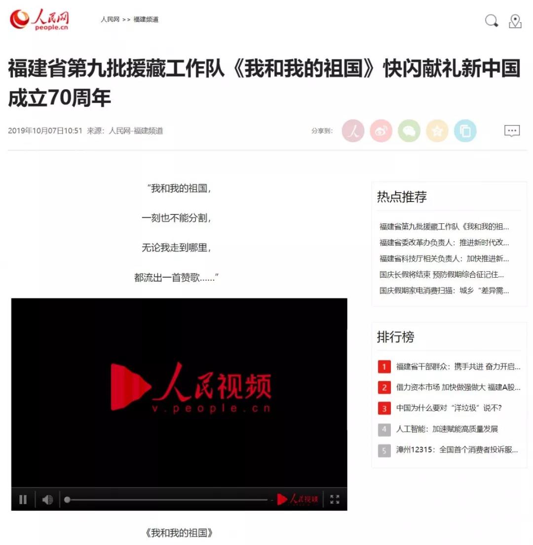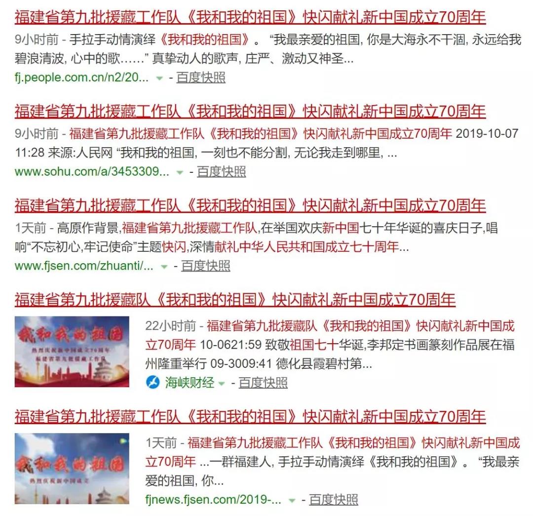 近日,人民网、新华网、“学习强国”、西藏日报、福建日报“新福建”、福建网络广播电视台、东南卫视、东南网、昌都发布、昌都广播电视台以及搜狐、腾讯、今日头条、百度、新浪微博等诸多媒体高度关注福建省第九批援藏工作队《我和我的祖国》快闪献礼新中国成立70周年—— 近日,福建省第九批援藏工作队和当地藏族同胞一起,在西藏昌都举办《我和我的祖国》主题快闪活动,献礼新中国成立七十周年。快闪视频在10月6日经“福建第九批援藏队”微信公众号发布后,引发了各媒体的广泛关注。不到24小时,公众号文章阅读量即超过1万,人民网、新华网、西藏日报客户端、福建日报、“新福建”客户端、福建网络广播电视台、东南网、昌都发布、昌都广播电视台客户端以及搜狐新闻、腾讯新闻、今日头条、百度新闻、新浪微博等诸多新闻媒体第一时间给予积极转载和专门报道。