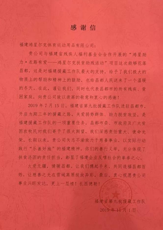 感谢信全文如下↓↓↓ 福建鸿星尔克体育运动用品有限公司: 贵公司与福建省残疾人福利基金会合作开展的“鸿星助力·衣路有爱——鸿星尔克扶贫助残活动”项目这次能够花落昌都,这是对福建援藏工作队最大的支持,给予了我们极大的物质上的帮助和精神上的鼓励,也给昌都人民送来了一个温暖的冬天。在此,谨让我们,同时也代表昌都市的所有残疾、贫困家庭,向贵司致以崇高的敬意和衷心的感谢! 2019年7月15日,福建省第九批援藏工作队进驻昌都市,开启为期三年的援藏之路。关爱弱势群体、助力脱贫攻坚,是福建援藏工作队的一项重要任务,昌都市委、市政府及广大贫困农牧民对我们寄予了很大期望,我们深感责任重大、使命光荣。长期以来,贵公司矢志不渝致力于慈善事业,以实际行动践行“乐善好施”的福建精神。你们的善行义举,充分体现了扶贫济困的责任担当,彰显了福建企业反哺社会的慈善温情。 大爱无疆,情暖昌都。让我们携起手来,共同造福昌都百姓,让慈善之光在雪域高原绽放异彩。最后,衷心祝愿贵公司事业兴旺发达,更上一层楼!扎西德勒! 福建省第九批援藏工作队 2019年11月1日 |