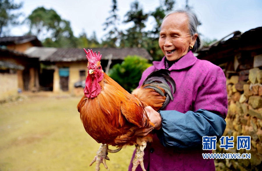 1月20日,在福建省长汀县河田镇根溪村,82岁的黄桂花抓起老公鸡乖乖。老公鸡乖乖是村里的“明星”,因为鸡年一到,这只河田鸡就满11岁了,相当于百岁老人。新华社记者魏培全摄
