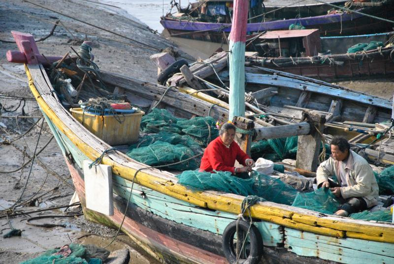 休渔时,渔夫妇在自己的小板船上修补渔网。2017年摄于泉州蟳埔码头