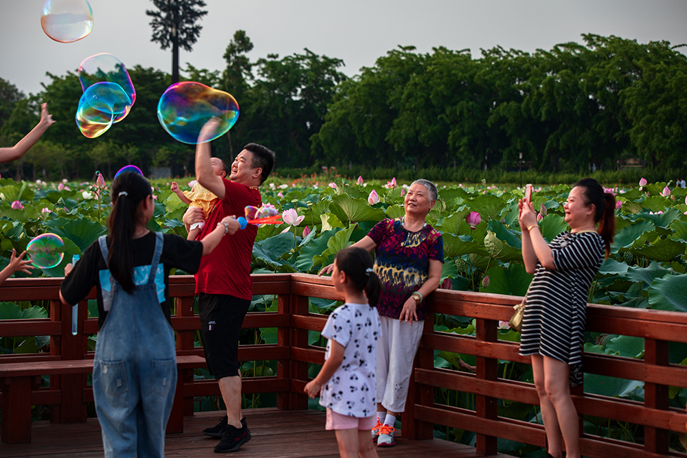 英桥荷花园是市民携家带口游玩的好地方。2019年6月22日摄于漳州龙文区英桥荷花园